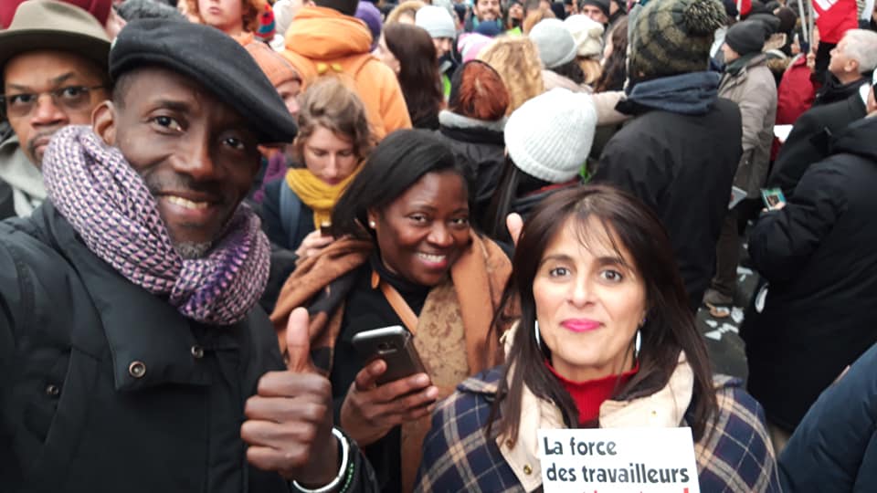 [#MobilisationRetraites ! Plus de 1,5 millions de participants. Une mobilisation historique pour une politique de retraite respectueuse des travailleurs et travailleuses. Parmis les manifestants de nombreux dionysien.n.e.s et des militant.e.s insoumi.e.s et de Faire Saint Denis En Commun. Ici avec mes amies de lutte Kaida Ki et Yari Sane…. Force et honneur à tous les syndicats, les retraités, salariés des fonctions publiques et du secteurs privés, jeunes… pour cette belle démonstration de force.